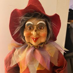 Häxdocka med kvast. Dockan har grått hår och är klädd i en rutig och randig klänning med förkläde. Kvasten är fäst vid dockans hand med ett snöre. Dockan är 25 cm hög.