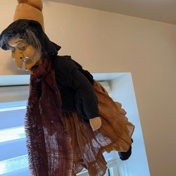 Häxdocka med grått hår, blå hatt och klänning med rött och vitt mönster. Dockan håller i en kvast.