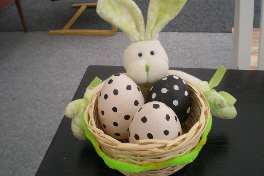 Påskdekoration med en mjuk påskhare som håller en liten korg. I korgen finns tre påskägg, två vita med svarta prickar och ett svart med vita prickar. Haren har långa, lurviga öron i ljusgrönt och vitt, samt svarta ögon och en grön nos.