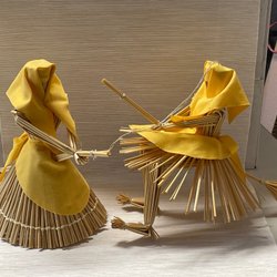 Två retro påskkärringar på kvast. Den ena påskkärringen har en svartvitrutig klänning och sjal, orange överdel och en svart katt. Den andra påskkärringen har en grönvitrutig klänning och sjal samt orange överdel. Båda har träfötter och träkvast.