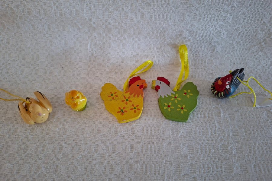 2 hönor i trä och övriga 3 keramik.