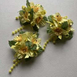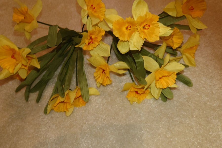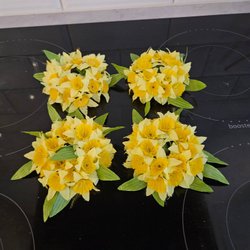 Två stycken buketter med konstgjorda påskliljor. Nio stycken i varje bukett.