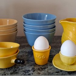 Äggbricka i keramik med plats för 16 ägg. Tillhörande krus från Höganäs Stengods, 1/2 L.