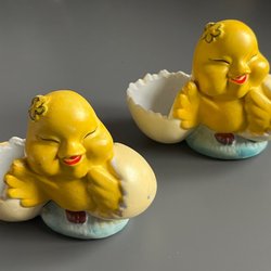 De är formade som hönor och tuppar med en fördjupning i ryggen för att hålla ett ägg.gjorda av keramik eller porslin och har detaljer som målade fjädrar, kammar och näbbar.