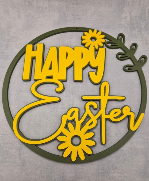 Fin och stilren påskskylt med texten “Happy Easter” och dekorativa blommor. Den runda formen gör den lätt att placera, passar lika bra på väggen som i ett fönster eller ståendes på en hylla.