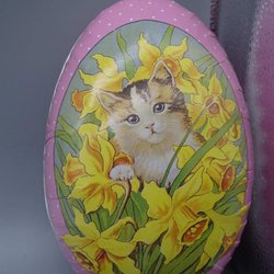 Äggkoppar i keramik tror jag (de är tjockare och tyngre än de i porslin) tre stycken med tryckta påskliljor. Vikt 225 g. Höjd lite mer än 6,5 cm.