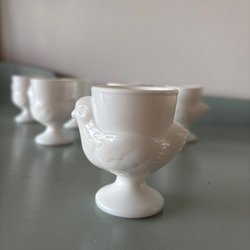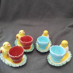 Äggkoppar i porslin, fyra stycken med samma motiv, en rad kycklingar runt kanten. Små nagg finns, se bilder. Höjd ca 6,5 cm. Vikt tillsammans 235 g.
