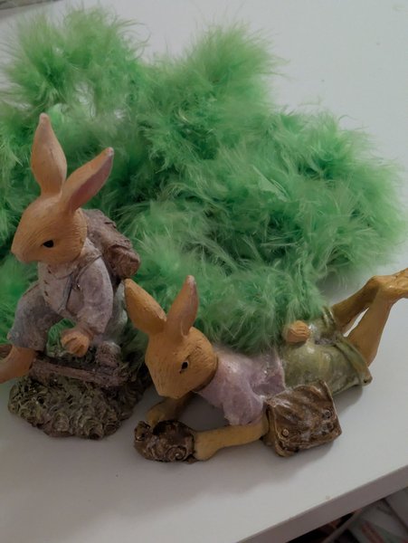 Två påskharar figurer. En hare sitter upprätt med en ryggsäck och den andra haren ligger ner med en väska. Figurerna är placerade framför en grön fjäderboa.