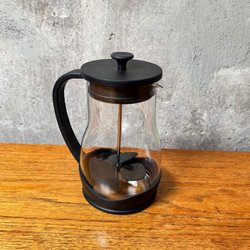 Kannan i klarplast och locket i rött. Ena kanten som helt täcker öppningen/pipen och andra sidan med ränder för att kunna sila drycken om man till exempel vill ha gurk-/apelsin-/citron-/limeskivor där i.