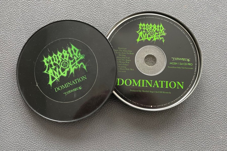 Morbid Angel - Domination CD. Skivan är märkt ”Promotion Only Not For Resale” och har katalognummer MOSH 134 CD PRO. Producerad av Morbid Angel och Bill Kennedy. Innehåller låtar som ”Dominate”, ”Where The Slime Live” och ”Hatework”.