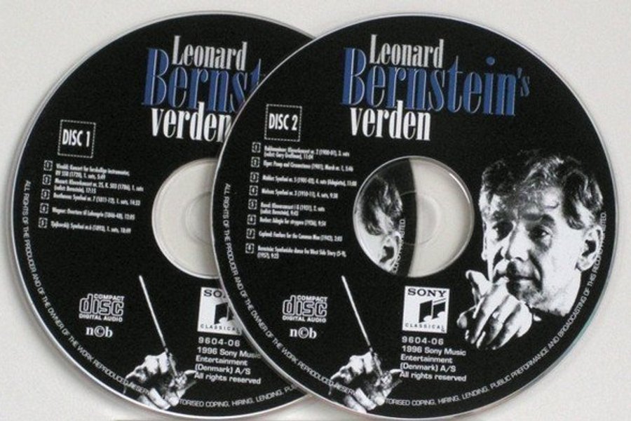 Två CD-skivor med Leonard Bernsteins Verden. Utgivna 1996 av Sony Music Entertainment (Denmark) A/S. https://www.discogs.com/release/8964900-Leonard-Bernstein-Leonard-Bernsteins-Verden