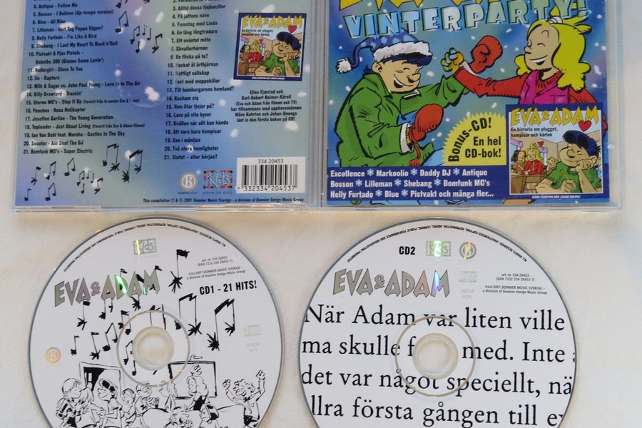CD-skiva med Eva & Adam - Vinterparty! Inkluderar en bonus CD-bok. CD1 innehåller 21 hits. CD2 är en CD-bok med Eva & Adam.