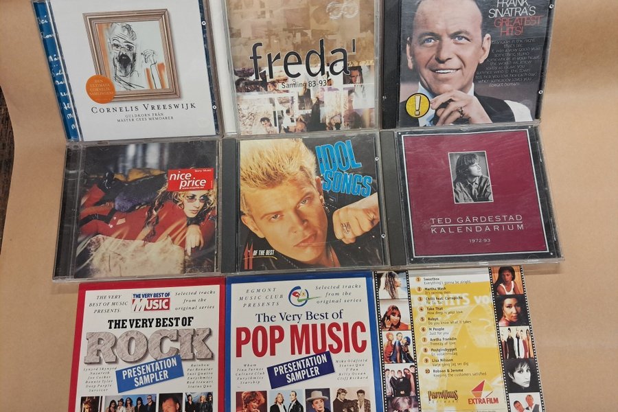 CD-samling med varierande artister och genrer. Inkluderar bland annat Cornelis Vreeswijk, Freda', Frank Sinatra, Billy Idol, Ted Gärdestad och diverse samlingsalbum med rock och pop.