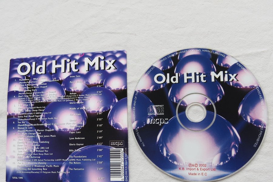 CD-skivan "Old Hit Mix" innehåller 16 låtar från olika artister. Speltiden är 53 minuter och 42 sekunder. Tillverkad i EU.