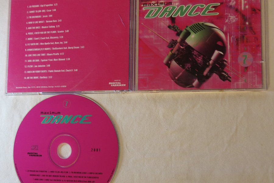 CD-skiva med "Maximum Dance 7" från 2001. Innehåller 14 låtar med artister som Gigi D'Agostino, Scooter och Mauro Picotto. Tillverkad av Digital Fabriken.