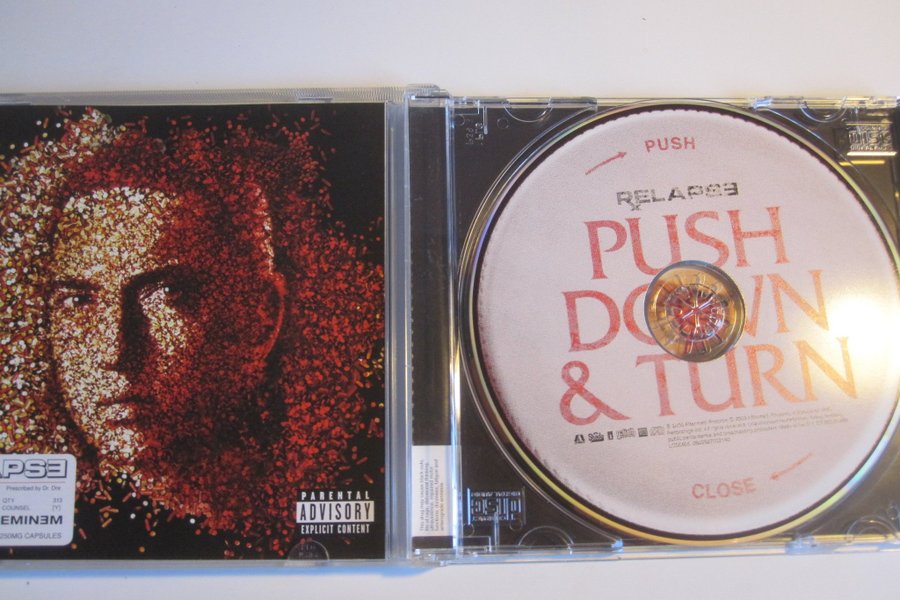 CD-skiva med albumet "Relapse" av Eminem. Skivan är märkt "Parental Advisory Explicit Content".