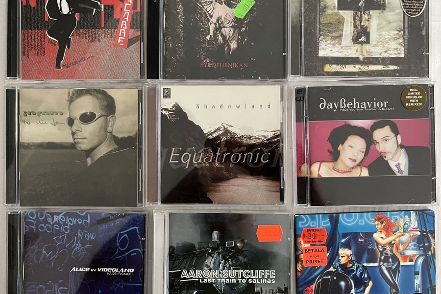 Ett blandat urval av CD-skivor innehållande The Faint - Danse Macabre, Delerium - Syrophenikan, Delerium - Karma, Infam - To Die For, Equatronic - Shadowland, Daybehavior - Have You Ever Touched a Dream?, Alice In Videoland - Maiden Voyage, Aaron Sutcliffe - Last Train To' Salinas, och Astrogirl.