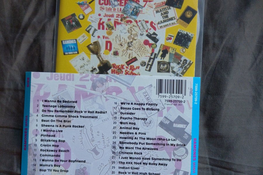 CD-skiva med Ramones Mania. Innehåller 30 låtar, inklusive "I Wanna Be Sedated", "Teenage Lobotomy" och "Blitzkrieg Bop". Tillverkad i Tyskland.