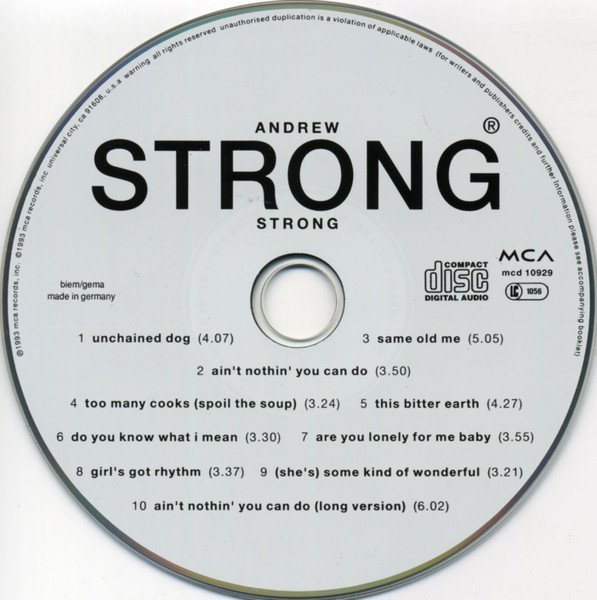 CD-skiva med Andrew Strong - Strong. Innehåller låtarna: Unchained Dog, Ain't Nothin' You Can Do, Same Old Me, Too Many Cooks (Spoil The Soup), This Bitter Earth, Do You Know What I Mean, Are You Lonely For Me Baby, Girl's Got Rhythm, (She's) Some Kind Of Wonderful, Ain't Nothin' You Can Do (Long Version).