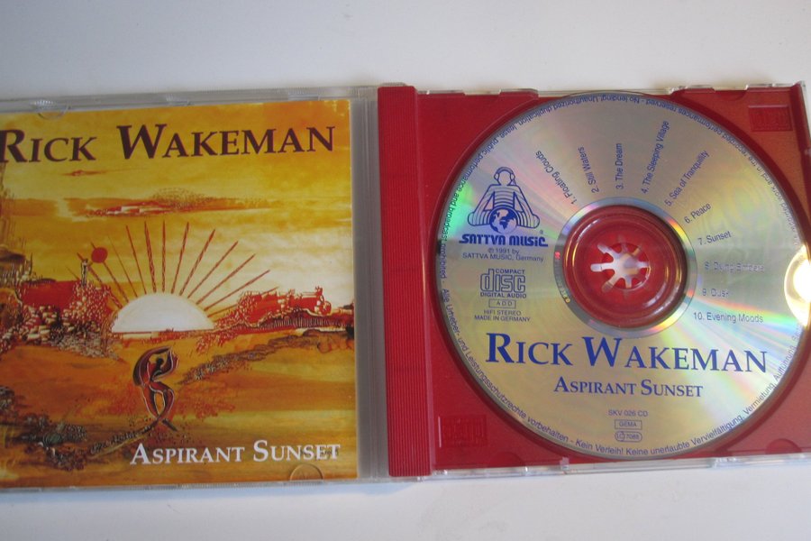 CD-album med Rick Wakeman – Aspirant Sunset. Skivan innehåller 10 låtar, bland annat "Floating Clouds", "Still Waters" och "The Dream". Tillverkad i Tyskland av Sattva Music 1991.