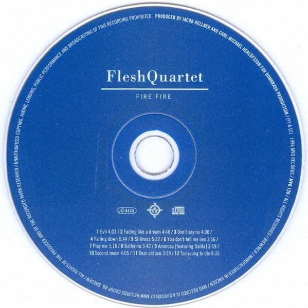 CD-skiva med Flesh Quartet - Fire Fire. Innehåller låtarna: Evil, Fading like a dream, Don't say no, Falling down, Stillness, You don't tell me lies, Play me, Ballerina, Amorosa (featuring Dalila), Second moon, Dear old you, Too young to die.