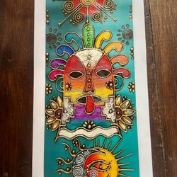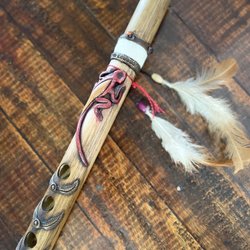 En vacker handgjord flöjt tillverkad i wayacan- trä, munstycket är gjord av ben. Utskuren figur upptill. Från Ecuador.