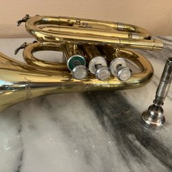 En väl använd B-kornett. En ägare. Inköpt ny 1963. Ventilerna löper lätt och byglarna är rörliga. Något sliten i lacken men inga bucklor. Stämplad Huttl West Germany. Med tillhörande väska i fint skick.