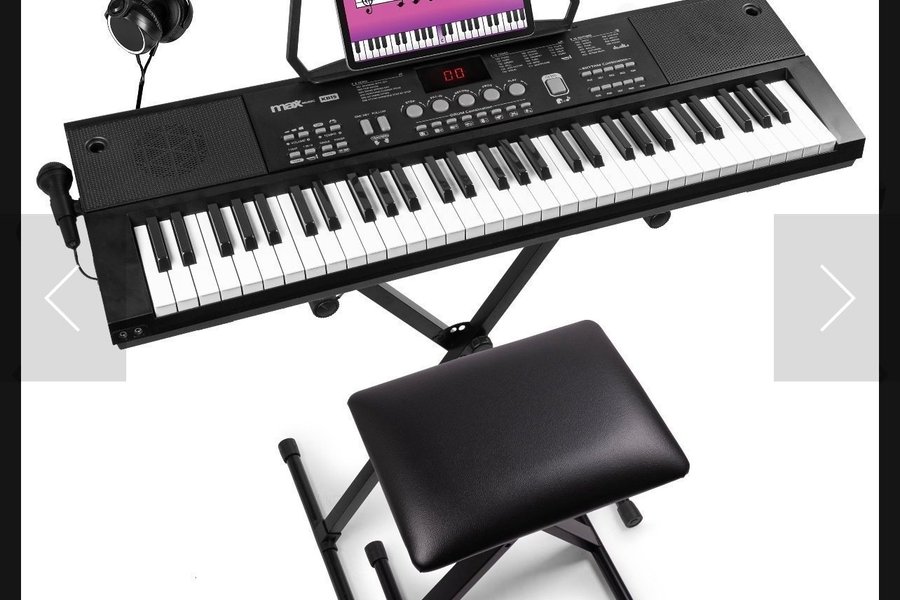 MAX KB15SET ELEKTRONISKT KEYBOARD - Tangentbordspiano. Levereras med hörlurar, mikrofon, notställ och en pall. Pianot har en hållare för surfplatta. Köpt för 2300 kr. Obs. Allt är ouppackat och kommer i samma oöppnade fraktkartong. Därav bild tagen från internet.