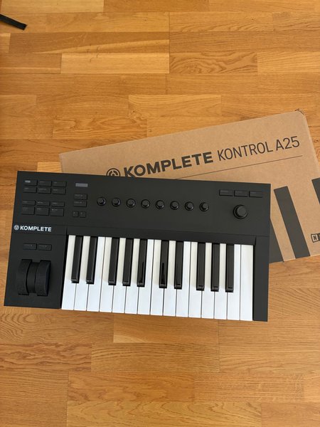 Native Instruments Komplete Kontrol A25 MIDI-keyboard med 25 tangenter. Kontrollen har pitch- och modulationshjul, samt knappar för oktav upp/ner. Den har även transportkontroller som play, rec, stop, loop, metro och tempo. Ytterligare funktioner inkluderar shift, undo, quantize, ideas, scale och arp. Det finns också knappar för preset upp/ner, browser, plug-in och track.
