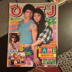 Tidningen Nya OKEJ från 1986 med artiklar om ZZ Top, Prince och Fame-serien. Innehåller även 2 affischer och 8 pop-stickers med Samantha Fox, Ozzy, Ralph Macchio, Madonna, Tom Cruise, Prince och Queensryche.