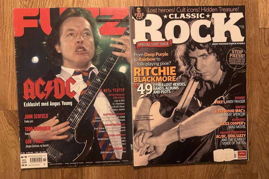 Två tidningar för musikälskare: Fuzz med AC/DC (Angus Young) på omslaget och Classic Rock med Ritchie Blackmore. Classic Rock 'Special Lost Issue' utan CD. Fuzz tidningen från December 2008, Nr 10, Interpress 0605-10.