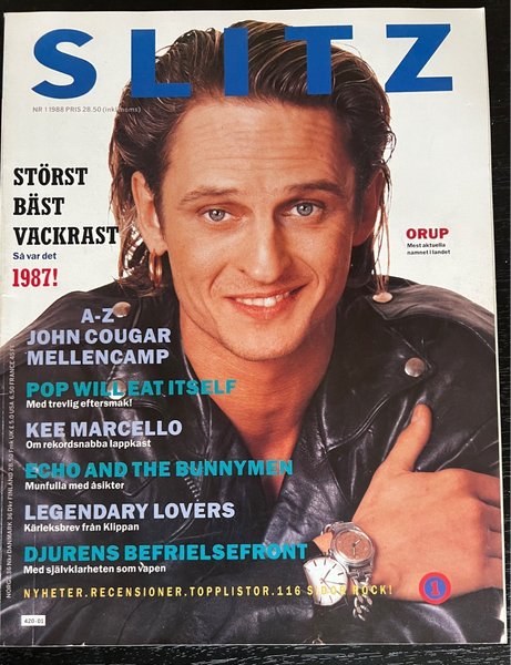 Tidning från 1988 med Orup på omslaget. Reportage om John Cougar Mellencamp, Pop Will Eat Itself, Kee Marcello, Echo and the Bunnymen, Legendary Lovers och Djurens Befrielsefront.