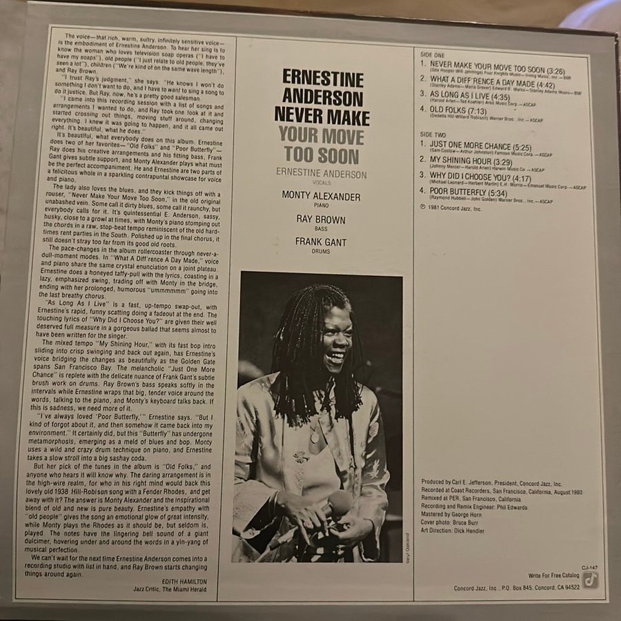 Ernestine Anderson - Never Make Your Move Too Soon, utgiven 1981 på Concord Jazz. Med Monty Alexander, Ray Brown och Frank Gant.
