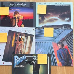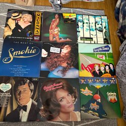 En samling av 30 LP-skivor med olika artister och genrer. Skivorna är förpackade i en kartong.