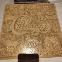 Chicago X vinylskiva. Skivan har en brun omslagsdesign med texten "Chicago" präglad. Baksidan av omslaget har en stor guldfärgad logotyp med texten "Chicago".
