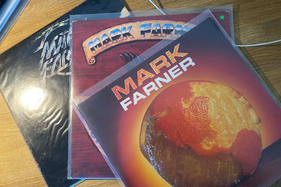Tre vinylskivor med Mark Farner. En av skivorna är "Wake up" och andra är "just another injustice" den tredje är "Mark Farner".