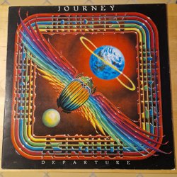 Journey - Evolution vinylskiva. Skivfodralet har en bild av bandet på baksidan och låtlistan på toppen. Skivan är producerad av Roy Thomas Baker.