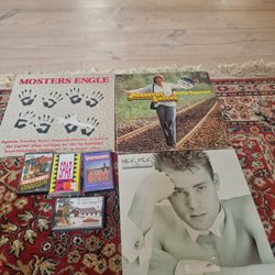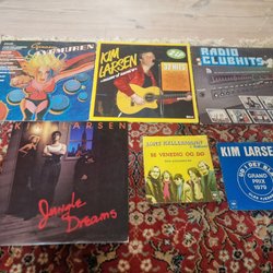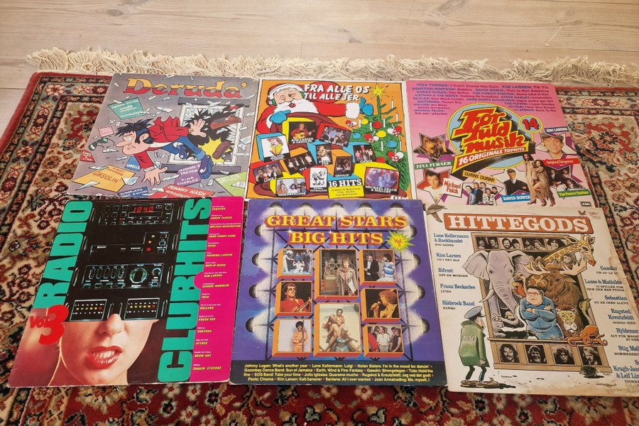 Seks blandede vinylplader med forskellige kunstnere og genrer. Indeholder titler som 'Deruda'', 'Fra alle os til alle jer', 'For fuld musik', 'Radio Clubhits Vol. 3', 'Great Stars Big Hits Vol. 3' og 'Hittegods'. Kunstnere inkluderer Kim Larsen, Tina Turner, David Bowie, Duran Duran, Gasolin, Michael Falch, Anne Linnet Band, Men at Work, Toto, Santana og mange flere.