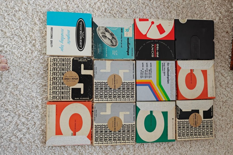Parti med rullband av olika märken som Tonecrest, Audiotape, Sony och Soundcraft. Ej årovade