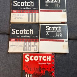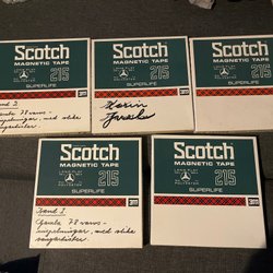Parti med 9 Scotch rullband. Banden är av olika modeller: 138, 175, 200, 150, 111 och 220. Alla band är i sina originalförpackningar. Vissa förpackningar har anteckningar på sig.