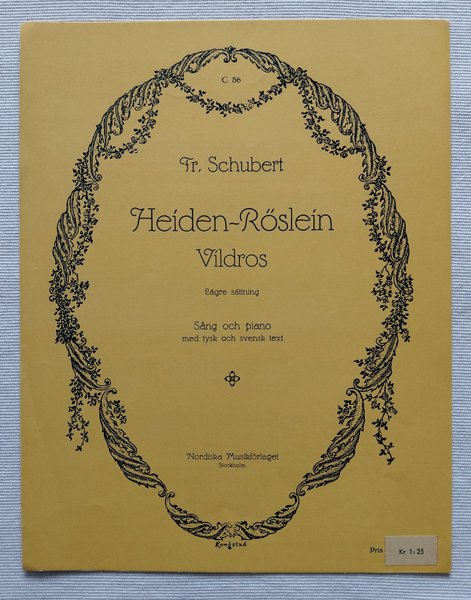 Heiden-Röslein / Vildros. Nordiska Musikförlaget, tryckår saknas. Sång av Franz Schubert. Opus 3, nr 3. Lösnot för sång & piano. Två versioner, Tysk och svensk text. Låg / mellansättning (E-dur).