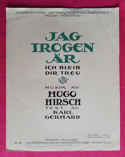 Jag trogen är. Skandinaviska Musikförlaget, troligen 1920-talet. Lösnot för sång & piano, svensk text av Karl-Gerhard. Stort format.