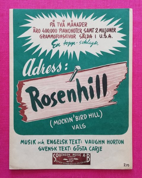 Adress Rosenhill. Southern Music 1951. Lösnot för sång / piano. Valsen "Mockingbird Hill".