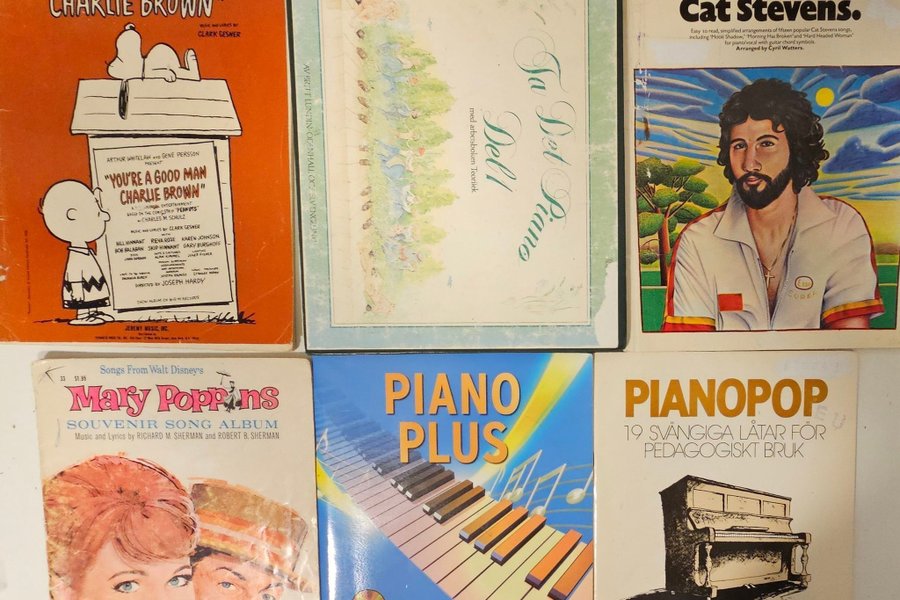 Samling 1 av noter för piano och sång. Inkluderar "You're a Good Man, Charlie Brown", "Ta Det Piano", "It's Easy To Play Cat Stevens", "Mary Poppins", "Piano Plus" av Lars Tidholm, och "Pianopop" av Lennart Brage.