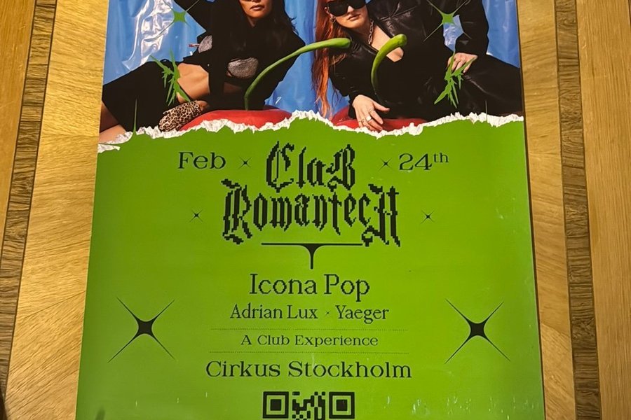 Affisch från Icona Pops spelning "Klubb Romantik" på Cirkus i Stockholm den 24 februari med Adrian Lux och Yaeger. Mått 50x70cm.