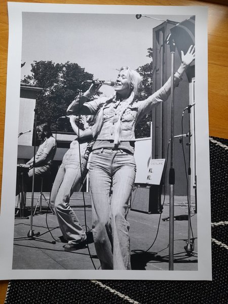 Svartvitt fotografi föreställande en kvinnlig artist som sjunger på scen. Hon håller en mikrofon och bär kläder i 70-talsstil. En annan musiker syns i bakgrunden. Bilden är tagen utomhus. Reprod. Mått: 45x60cm. Material: Glansigt papper. Troligtvis Agneta Fältskog på Lisebergs Stora Scen 1973.