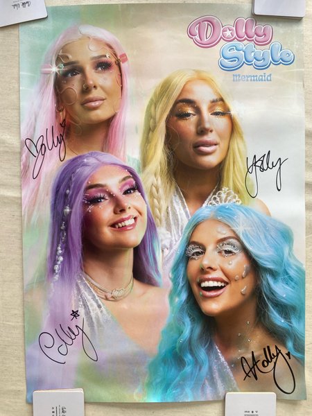 Affisch med Dolly Style. Föreställer fyra medlemmar i gruppen. Signaturer finns på affischen.