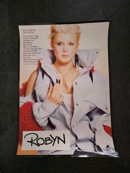 Affisch med Robyn. Affischen visar Robyn med texten "NEW ALBUM OUT NOW!" och en låtlista som inkluderar "Curriculum vitae", "Who's that girl?", "Handle me", "Robotboy", "Be mine!", "Bionic woman", "Crash and burn girl", "Tomfeverkstan", "Konichiwa bitches", "Bum like you", "Eclipse", "Should have known" och "Anytime you like".