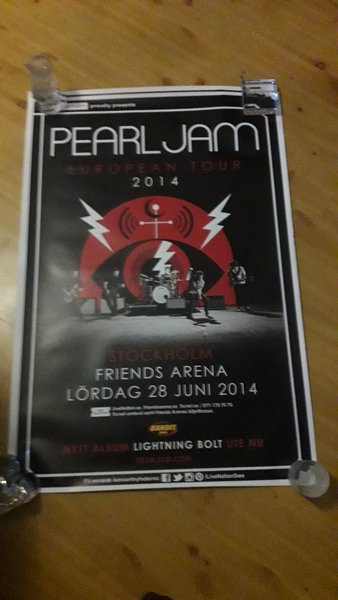 Affisch för Pearl Jam European Tour 2014. Konserten hölls i Stockholm på Friends Arena lördag 28 juni 2014. Affischen annonserar även bandets album "Lightning Bolt".