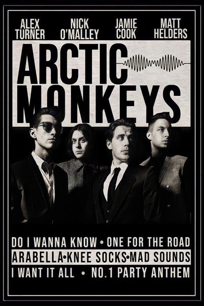Affisch med Arctic Monkeys. Bandmedlemmarna Alex Turner, Nick O'Malley, Jamie Cook och Matt Helders är avbildade. Låtnamn som "Do I Wanna Know", "One For The Road", "Arabella", "Knee Socks", "Mad Sounds", "I Want It All" och "No.1 Party Anthem" finns med på affischen.